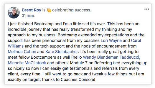Many members love the step-by-step guidance to setting up their business and simultaneously learning how to maximize their Console system and all its features. Our Bootcampers report getting to the results they want (and organized, professional business, growing their list, engaging new clients and charging what they’re worth) much faster then they could have on their own.